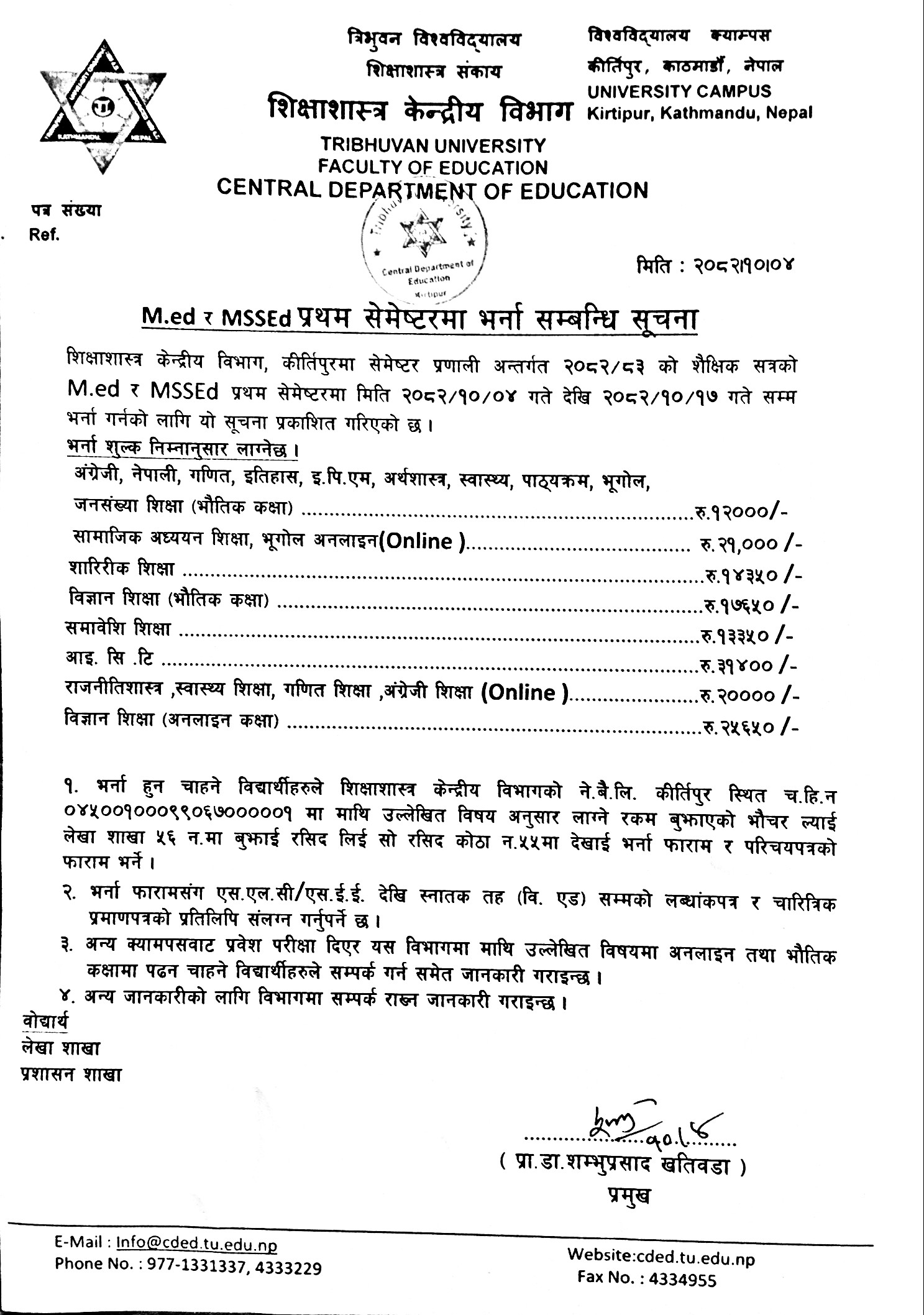 M.Ed. र MSSEd. प्रथम सेमेष्टरमा भर्ना सम्बन्धी सूचना ।