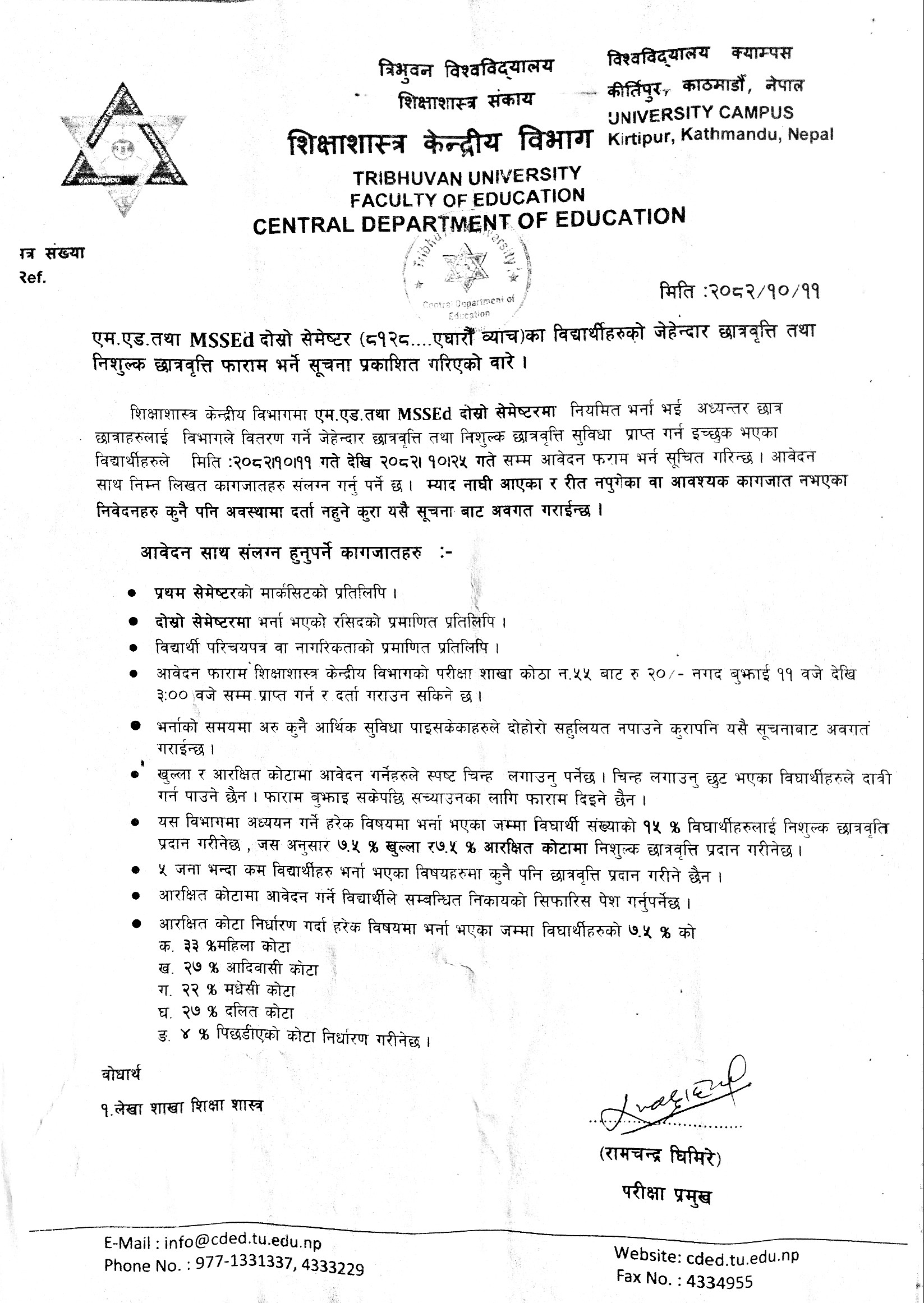 एम.एड. दोस्रो सेमेष्टरका विद्यार्थीहरुको जेहेन्दार छात्रवृत्ति तथा छात्रवृत्ति फाराम भर्ने सूचना ।