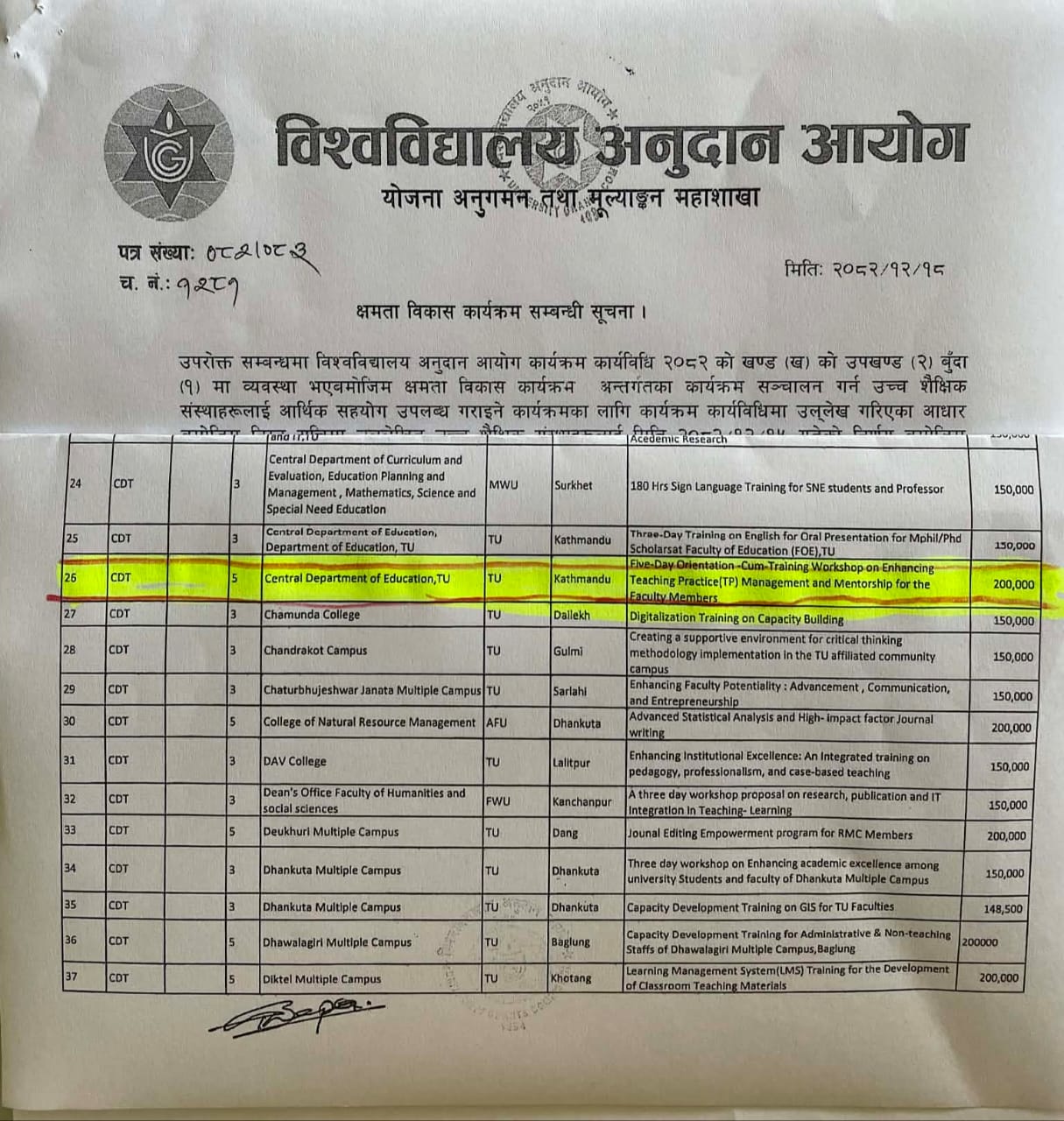 शिक्षण अभ्यास सम्बन्धी गाेष्ठीका लागि विश्वविद्यालय अनुदान आयाेगबाट छनाेट भएकाेमा हार्दिक आभार सहित ।