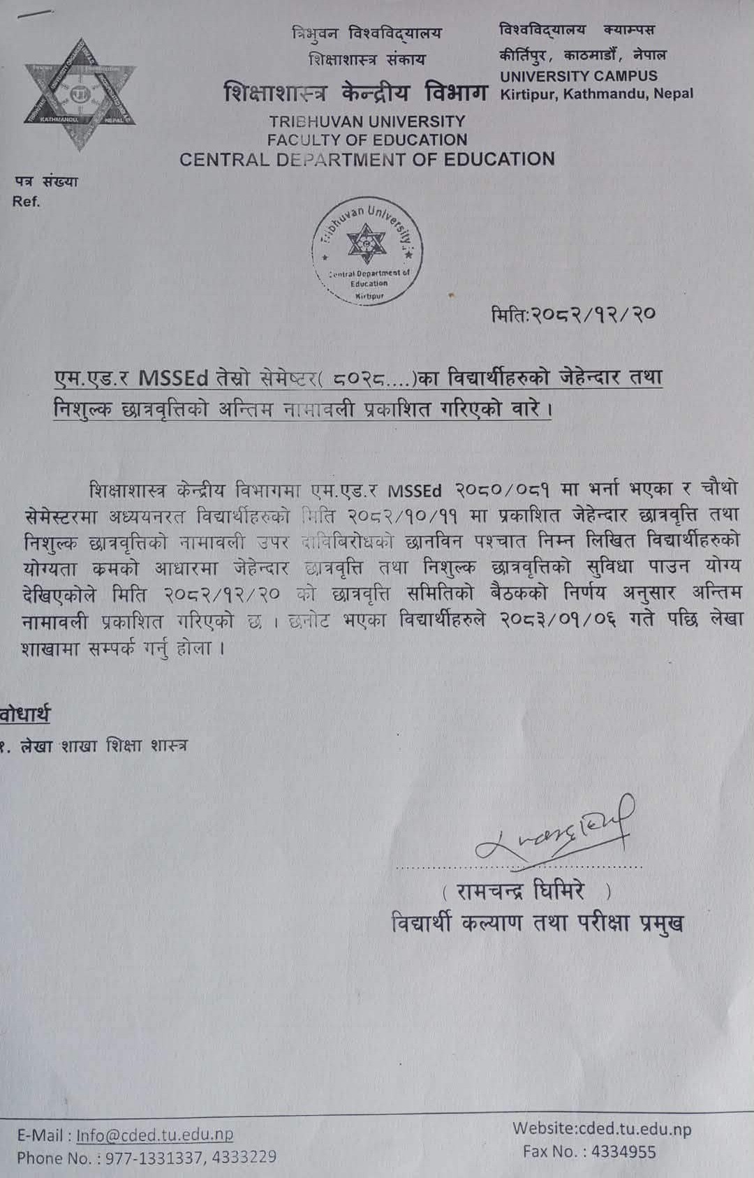 M.Ed र MSSEd तेस्राे सेमेष्टर (८०२८.........) का विद्यार्थीहरुकाे जेहेन्दार छात्रवृत्ति तथा निशुल्क छात्रवृत्तिकाे अन्तिम नामावली प्रकाशित गरिएकाे बारे ।