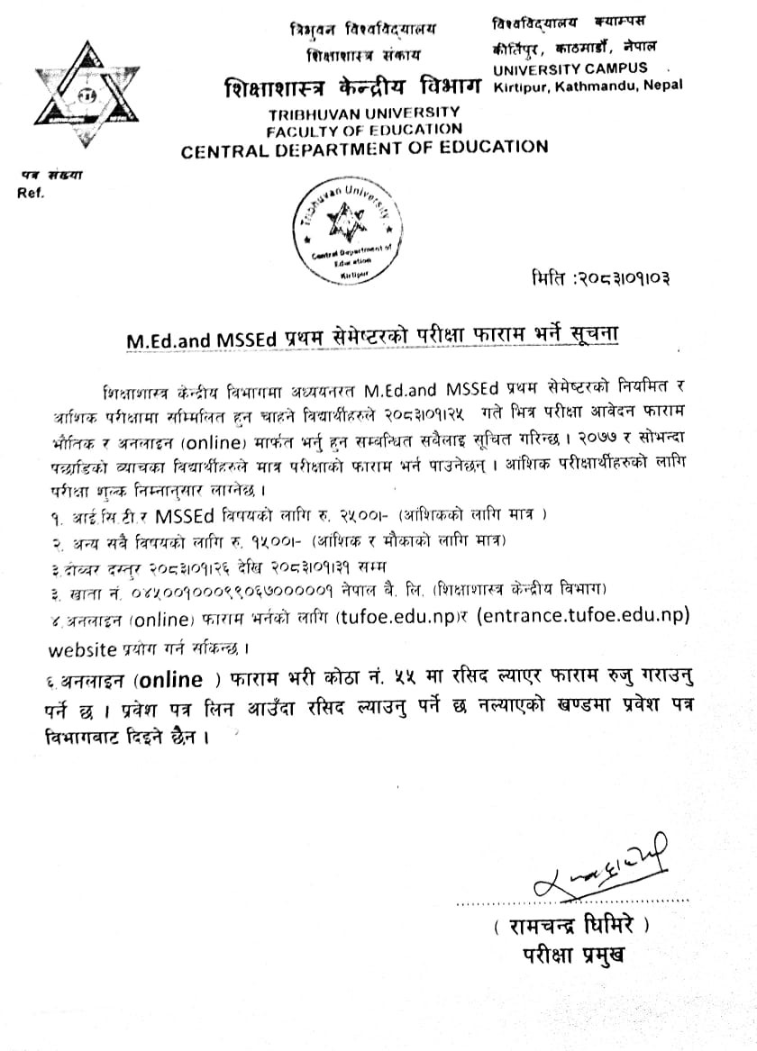 M.Ed and MSSEd प्रथम सेमेष्टरकाे परीक्षा फाराम भर्ने सम्बन्धी सूचना ।