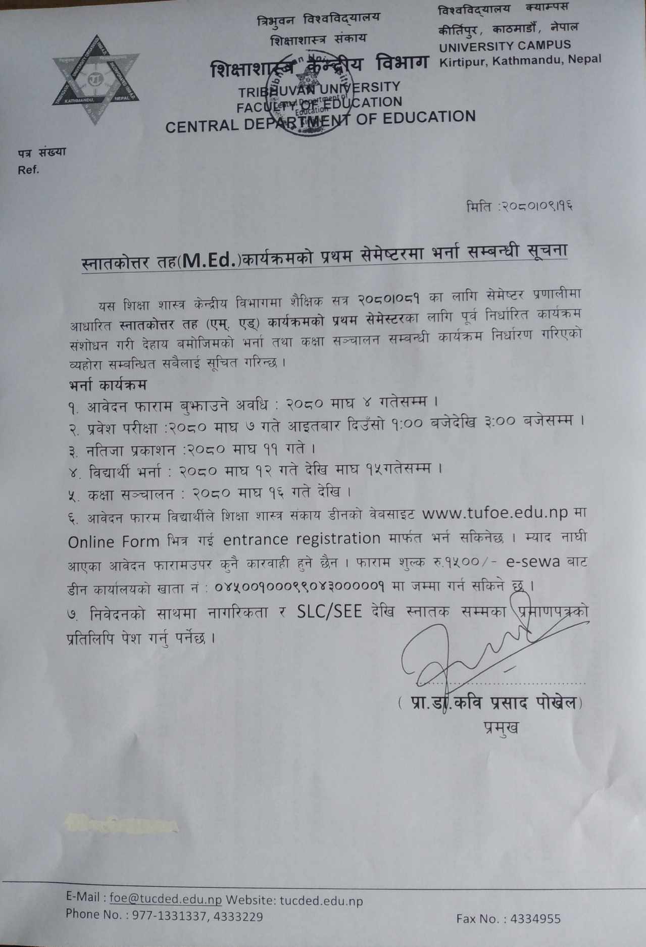 स्नातकोत्तर तह (M.Ed) कार्यक्रमको प्रथम सेमेष्टरमा भर्ना सम्बन्धी संशोधित कार्यतालिका सम्बन्धी सूचना