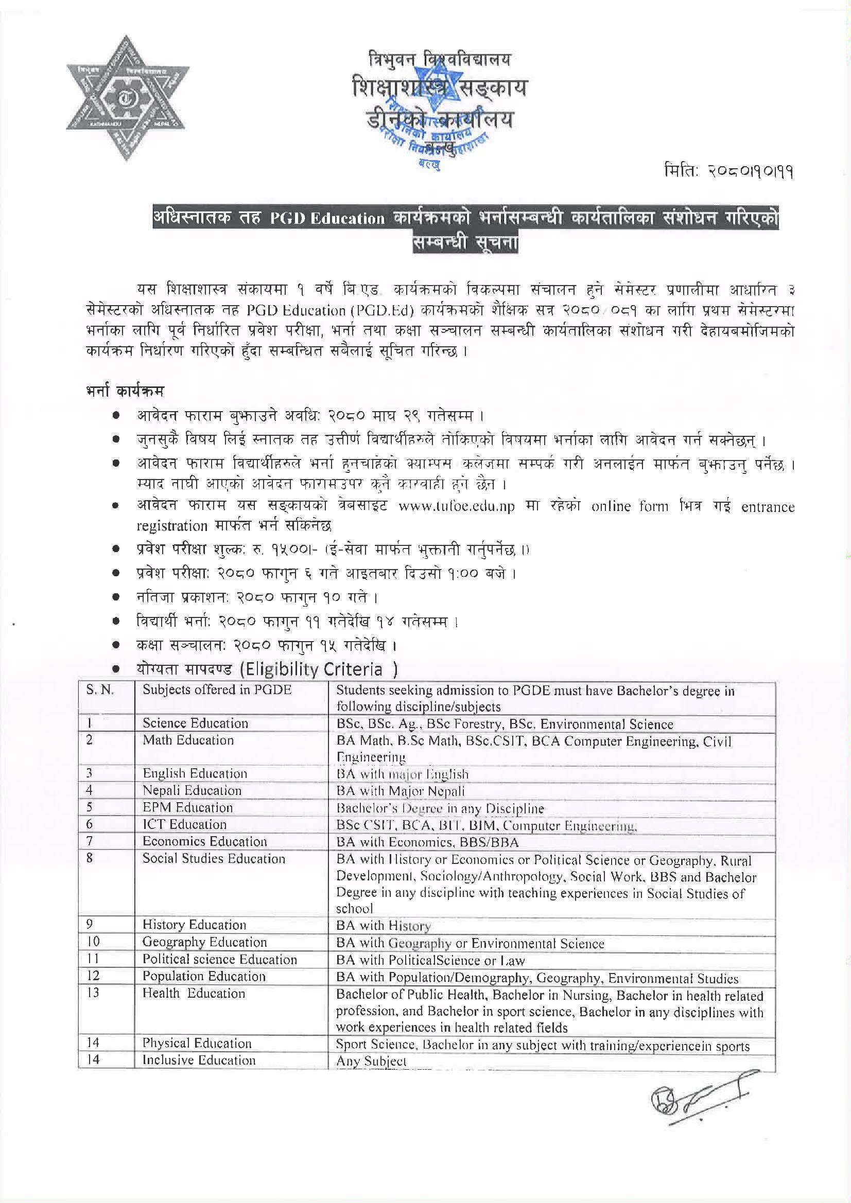 अधिस्नातक तह PGD Education कार्यक्रको भर्नासम्बन्धी कार्यतालिका संशोधन गरिएको सम्बन्धी सूचना