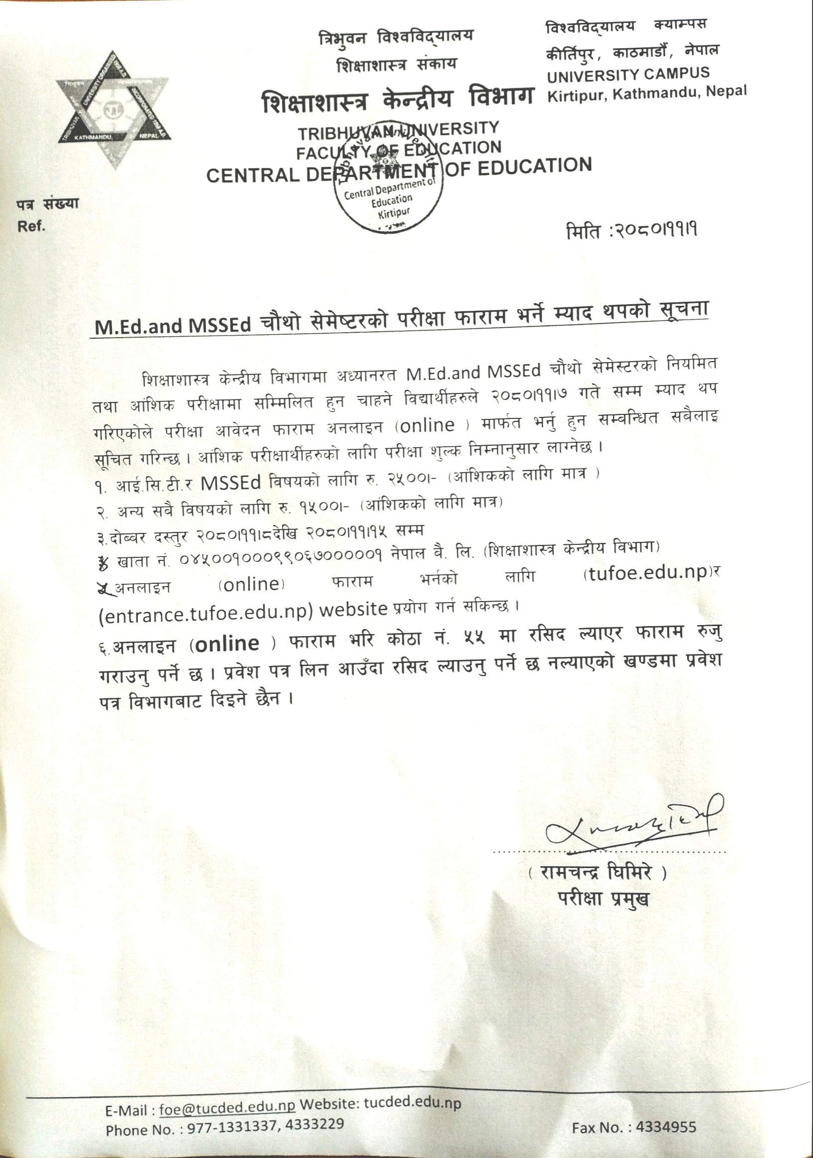 M.Ed and MSSEd चाैथाे सेमेस्टरकाे परीक्षा फाराम भर्ने म्याद थपकाे सूचना