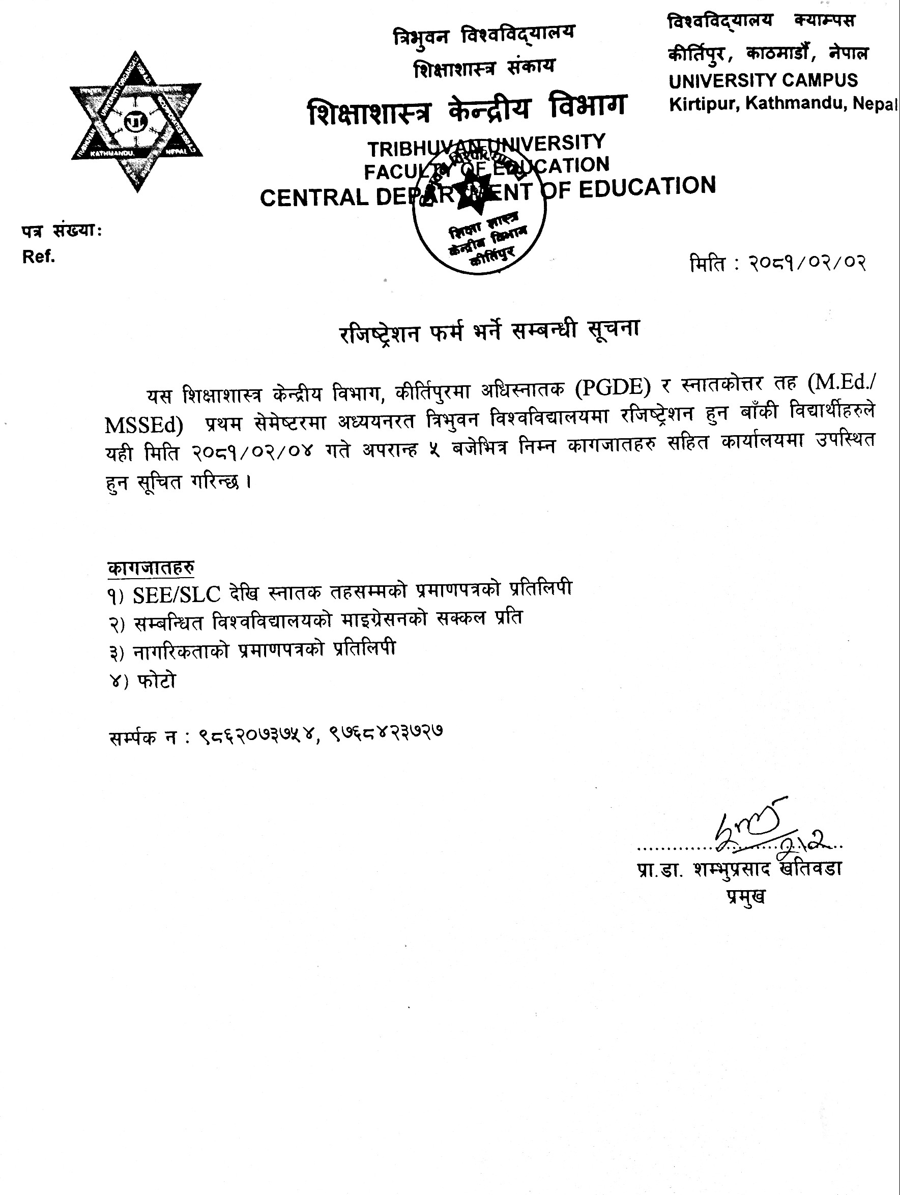 M.Ed and MSSEd प्रथम सेमेष्टरकाे परीक्षा फाराम भर्ने सम्बन्धी सूचना ।