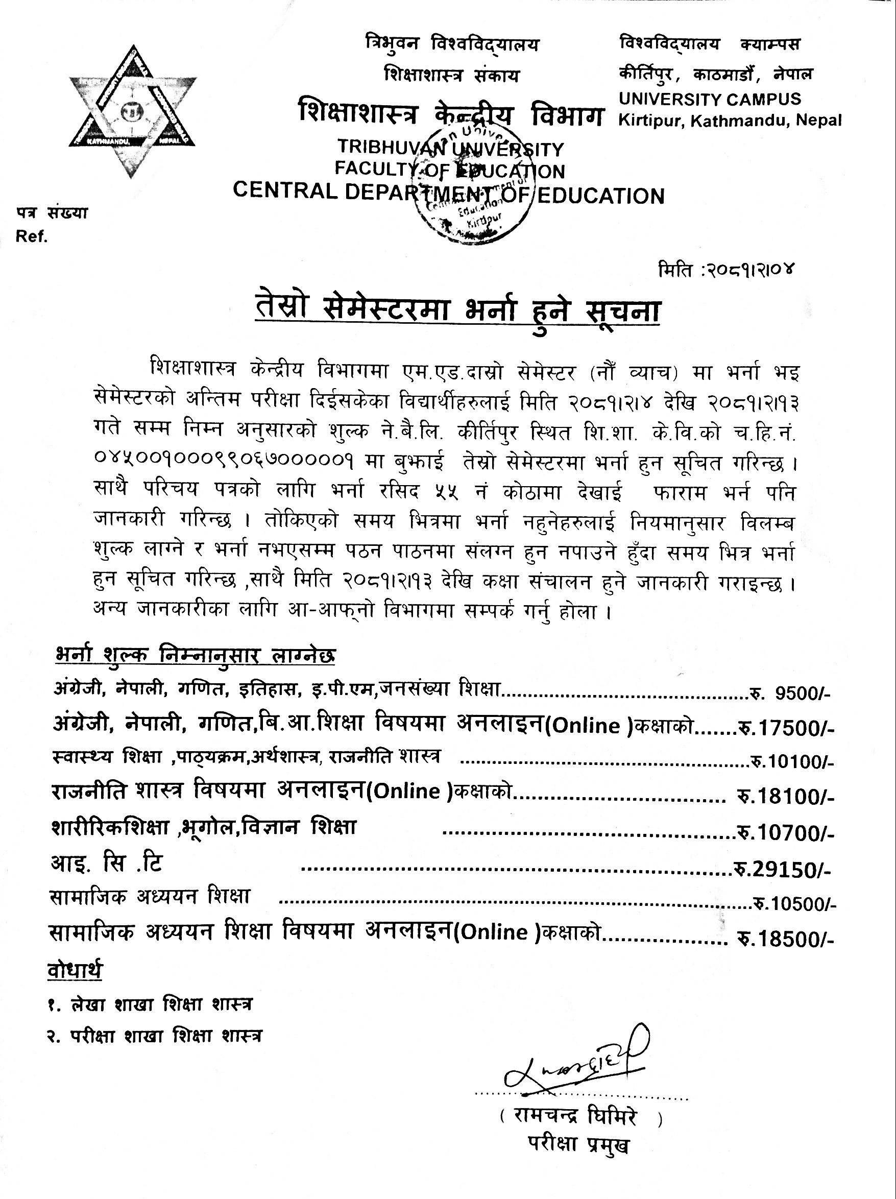 M.Ed and MSSEd प्रथम सेमेष्टरकाे परीक्षा फाराम भर्ने सम्बन्धी सूचना ।