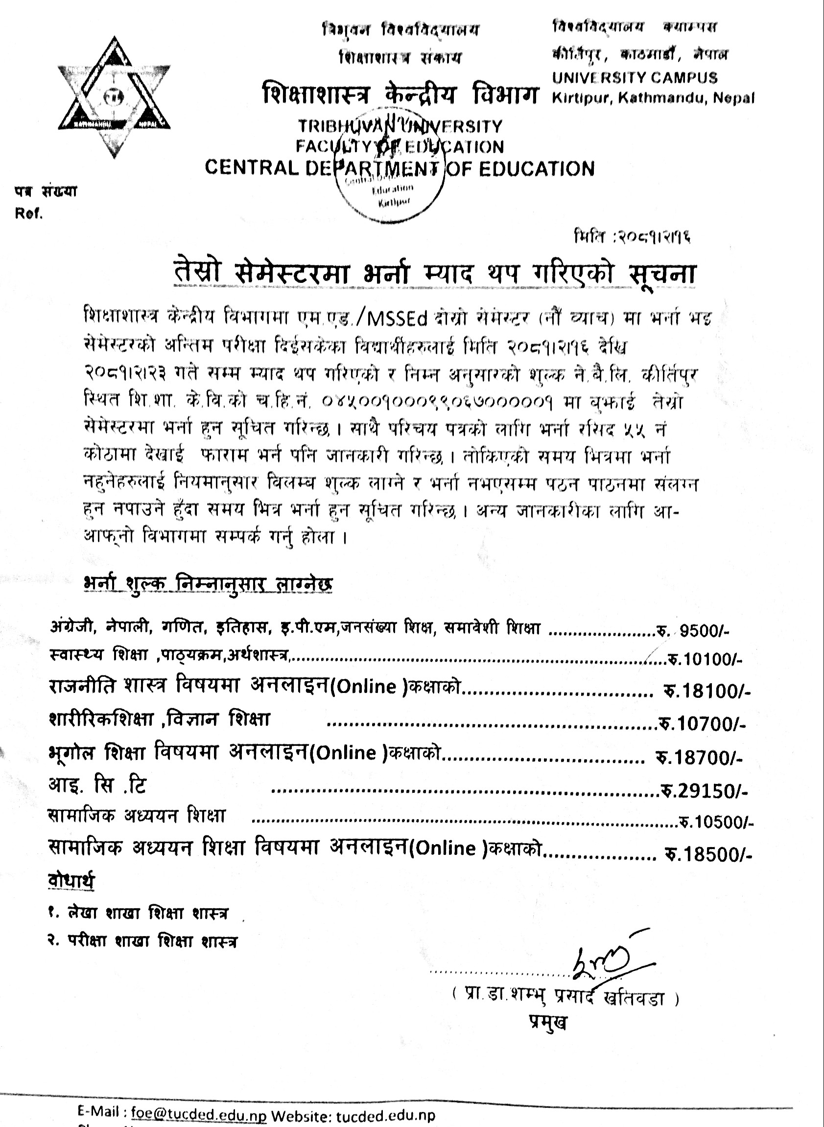 M.Ed and MSSEd प्रथम सेमेष्टरकाे परीक्षा फाराम भर्ने सम्बन्धी सूचना ।