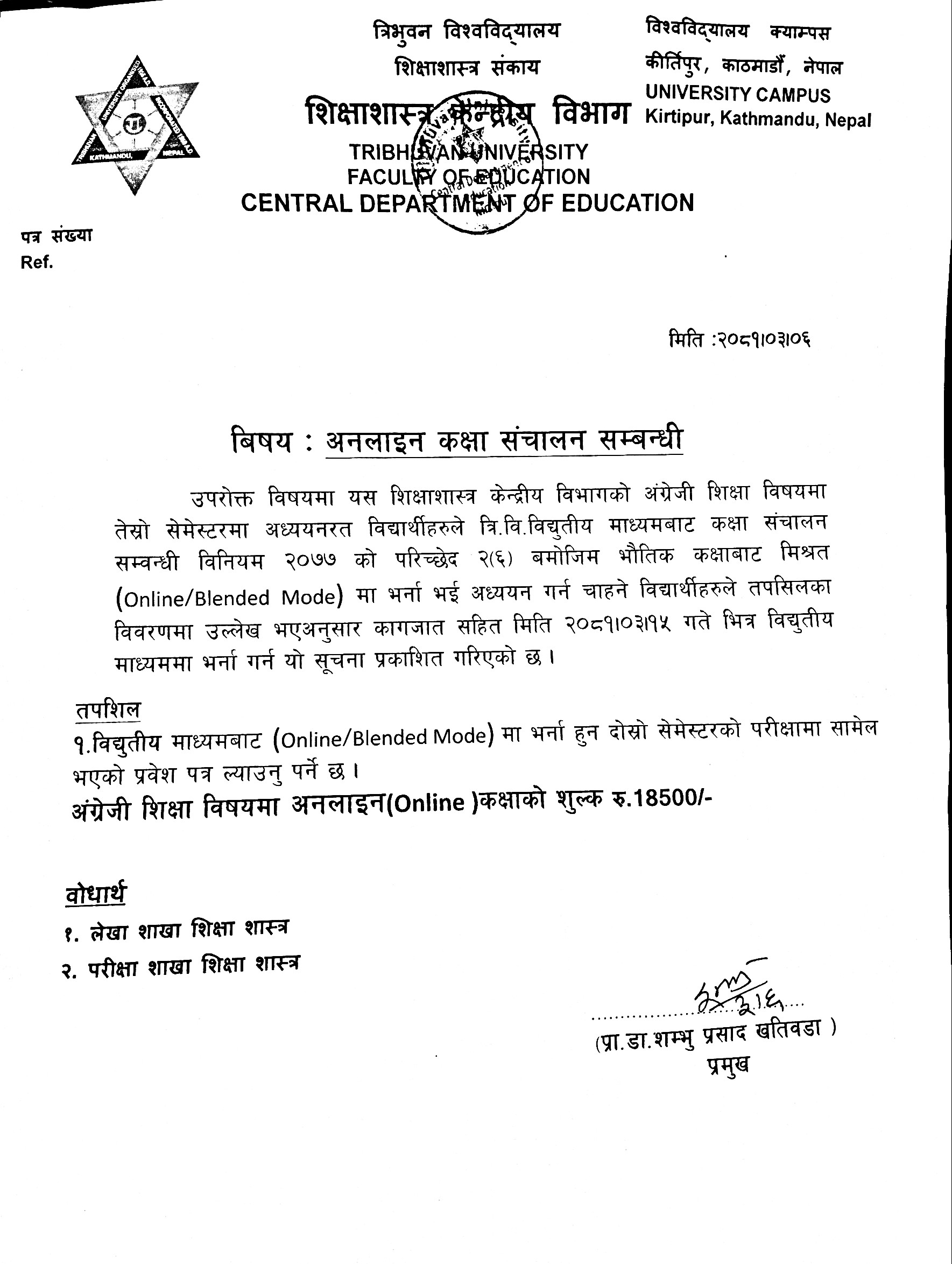 तेस्राे semester मा अनलाइन कक्षा संचालन सम्बन्धी सूचना