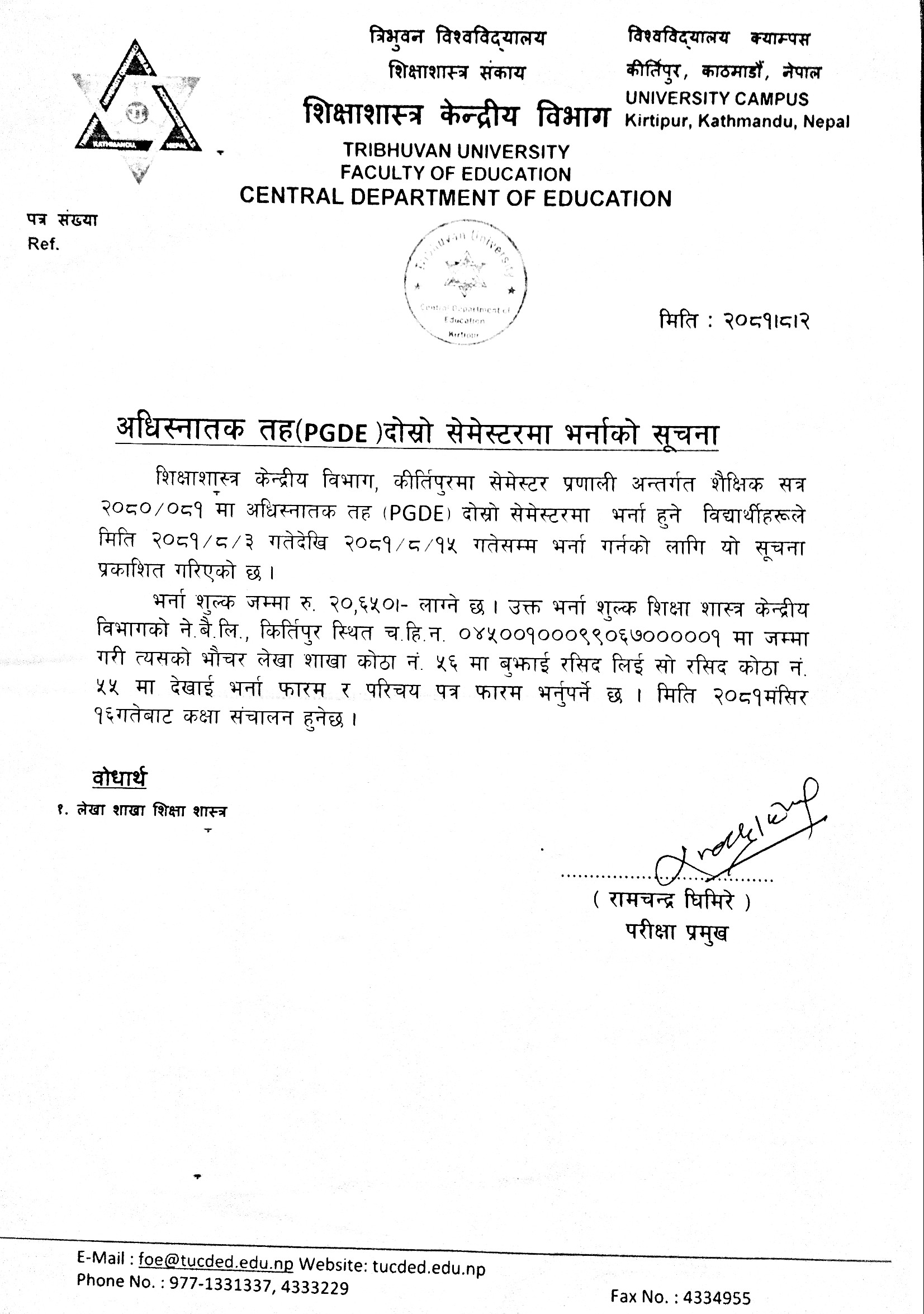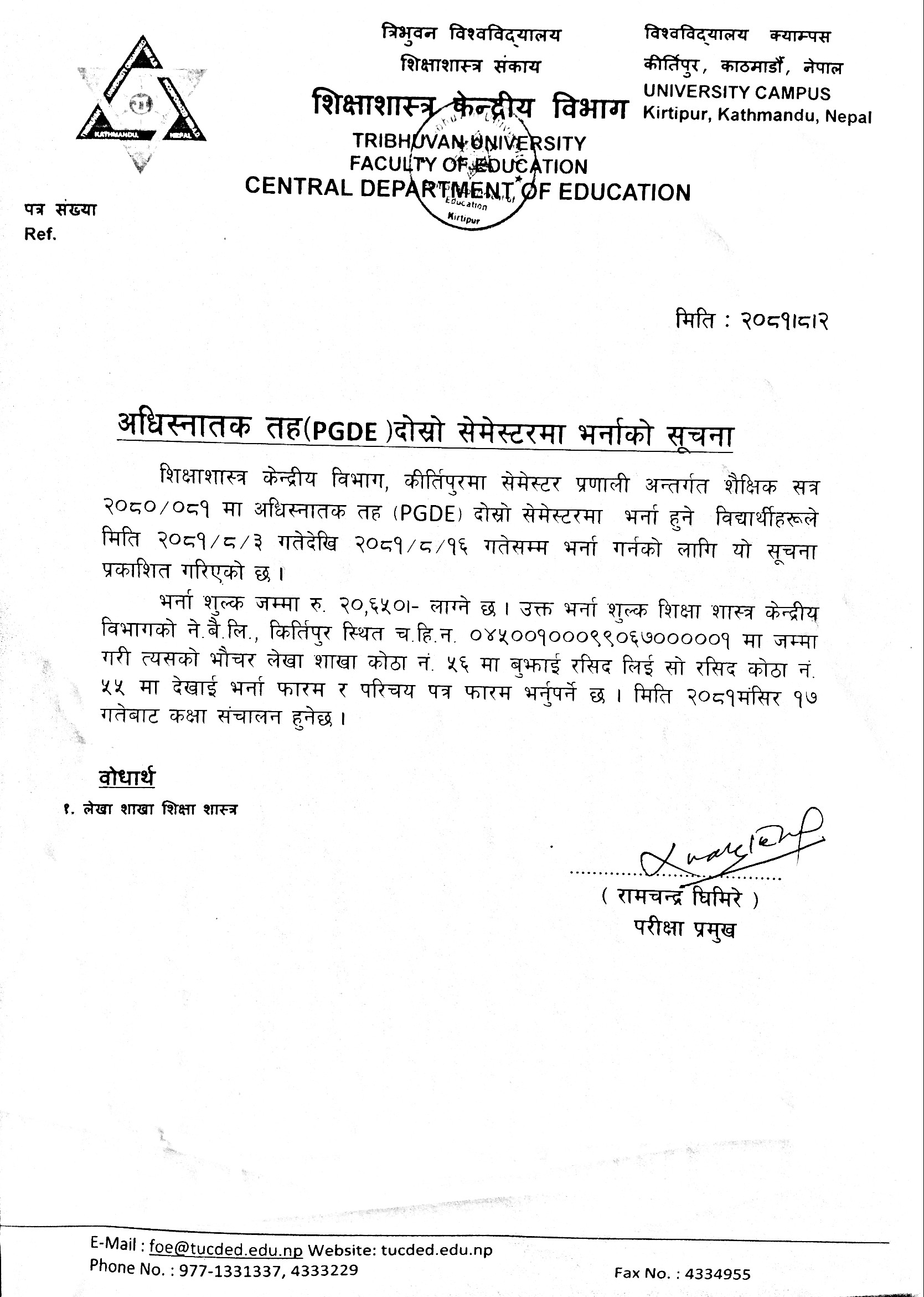 अधिस्नातक तह (PGDE) दाेस्राे सेमेस्टरमा भर्नाकाे सूचना