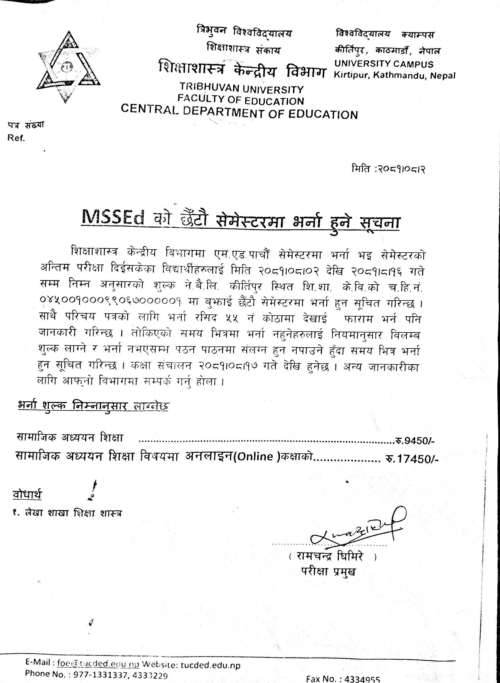 M.Ed and MSSEd प्रथम सेमेष्टरकाे परीक्षा फाराम भर्ने सम्बन्धी सूचना ।