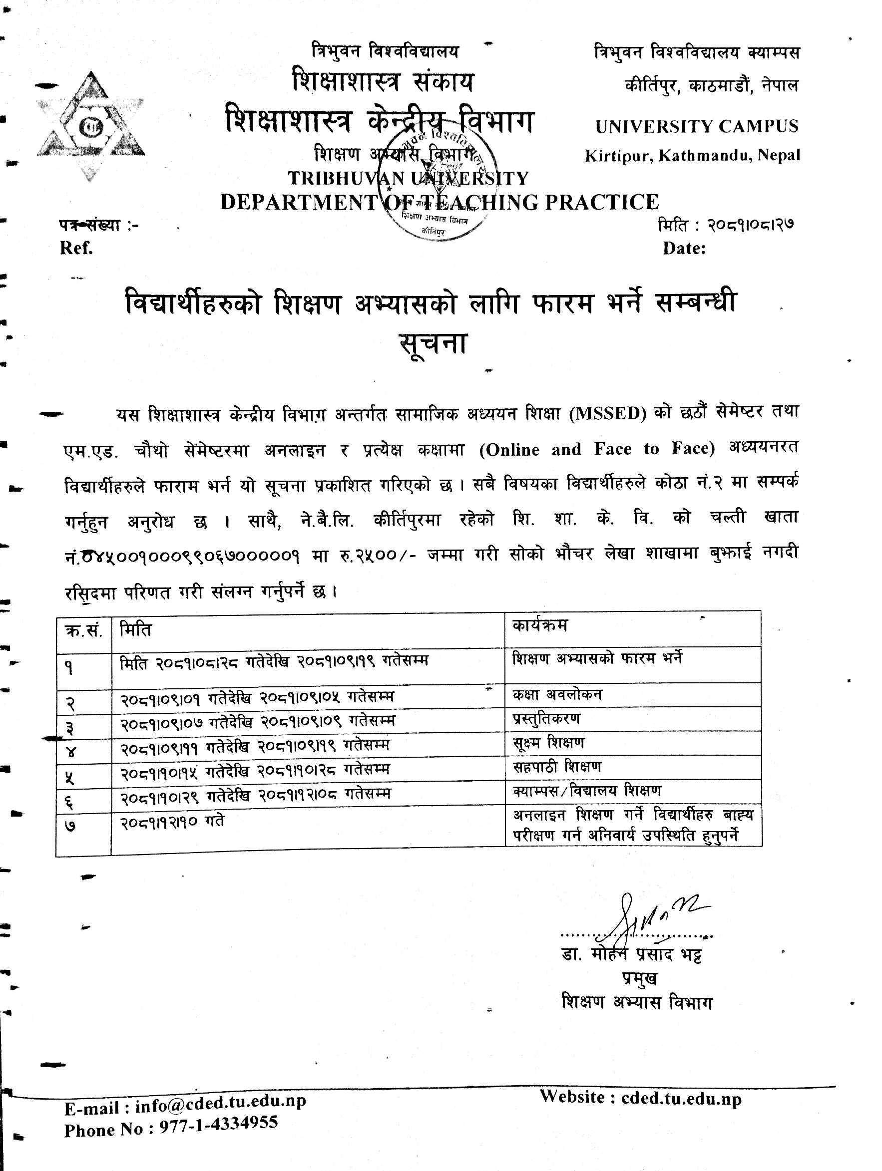 एम.एड. चाैथाे र MSSEd छैठाैं सेमेष्टरका विद्यार्थीहरूकाे शिक्षण अभ्यासकाे लागि फारम भर्ने सम्बन्धी सूचना