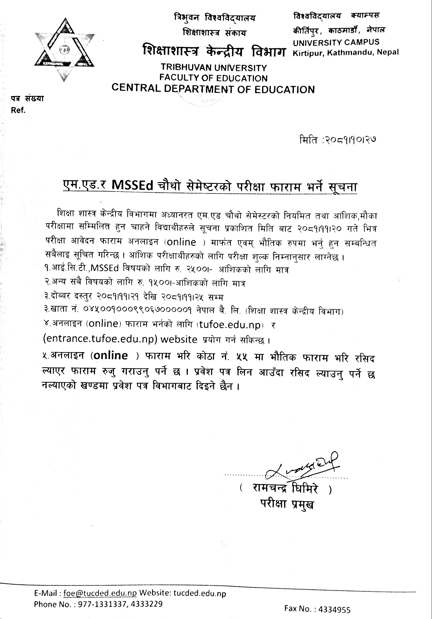 M.Ed र MSSEd चाैथाे सेमेस्टरकाे परीक्षा फाराम भर्ने सम्बन्धी सूचना ।