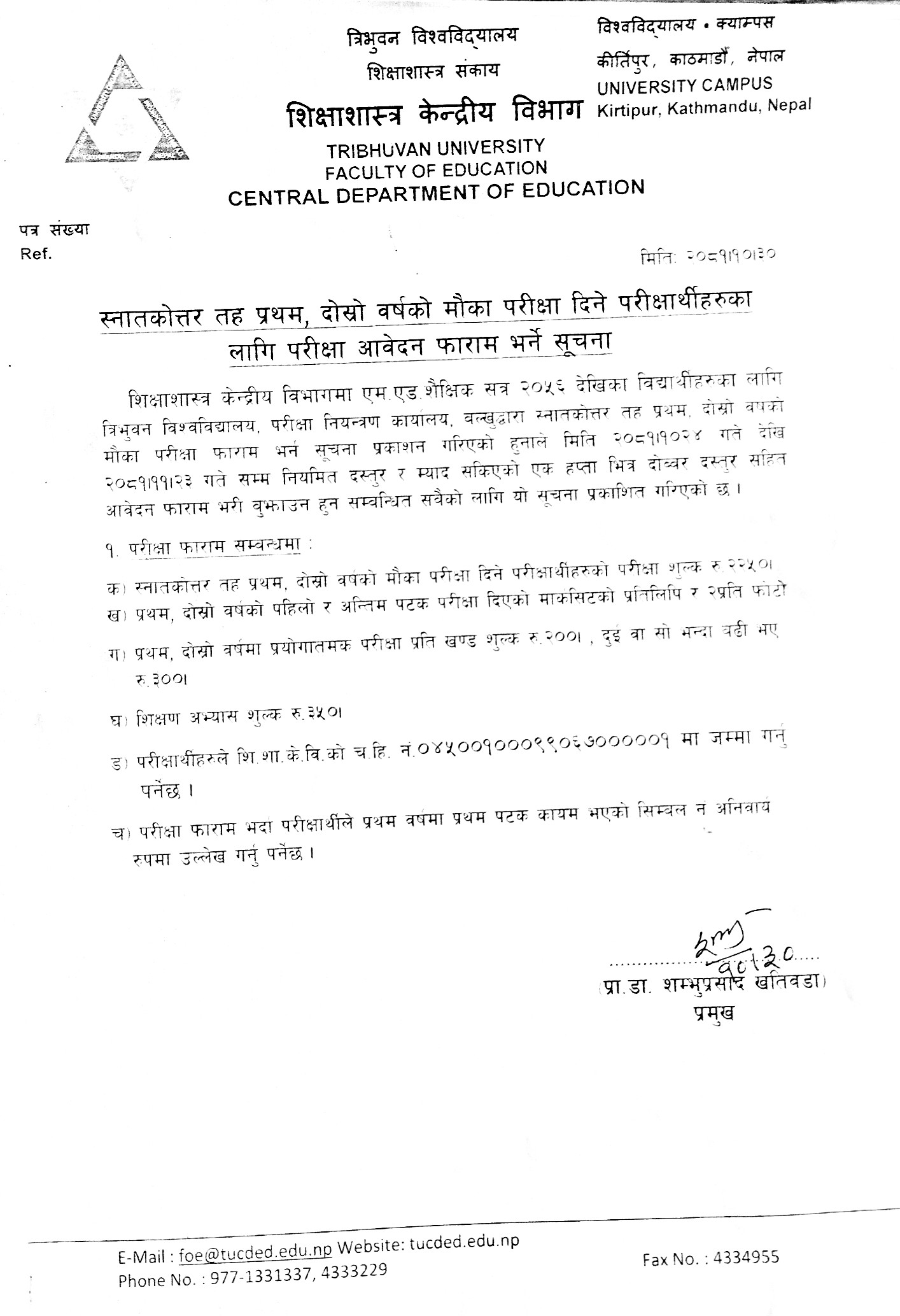 M.Ed and MSSEd प्रथम सेमेष्टरकाे परीक्षा फाराम भर्ने सम्बन्धी सूचना ।