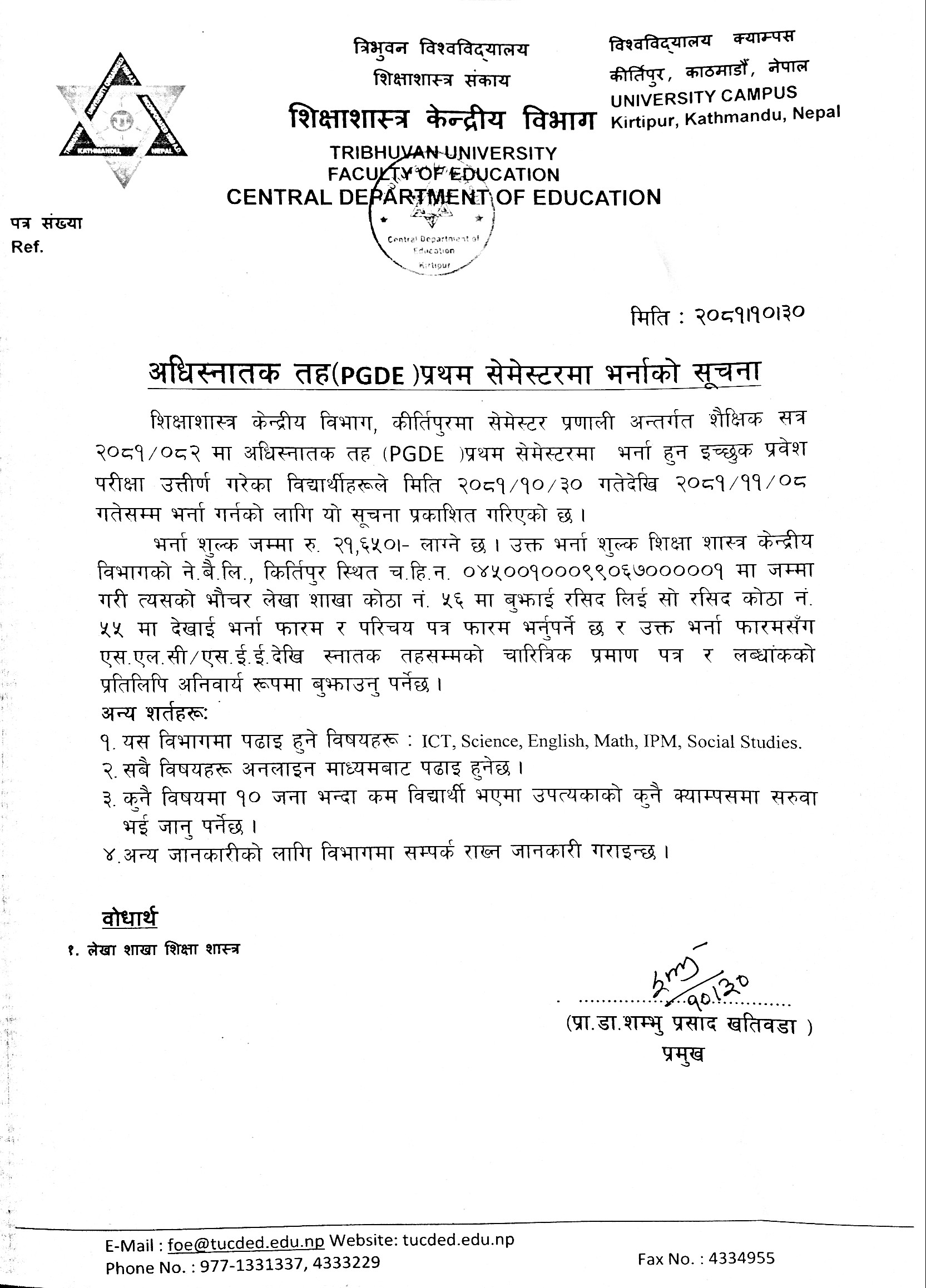 अधिस्नातक तह (PGDE) प्रथम सेमेस्टरमा भर्ना सम्बन्धी सूचना ।
