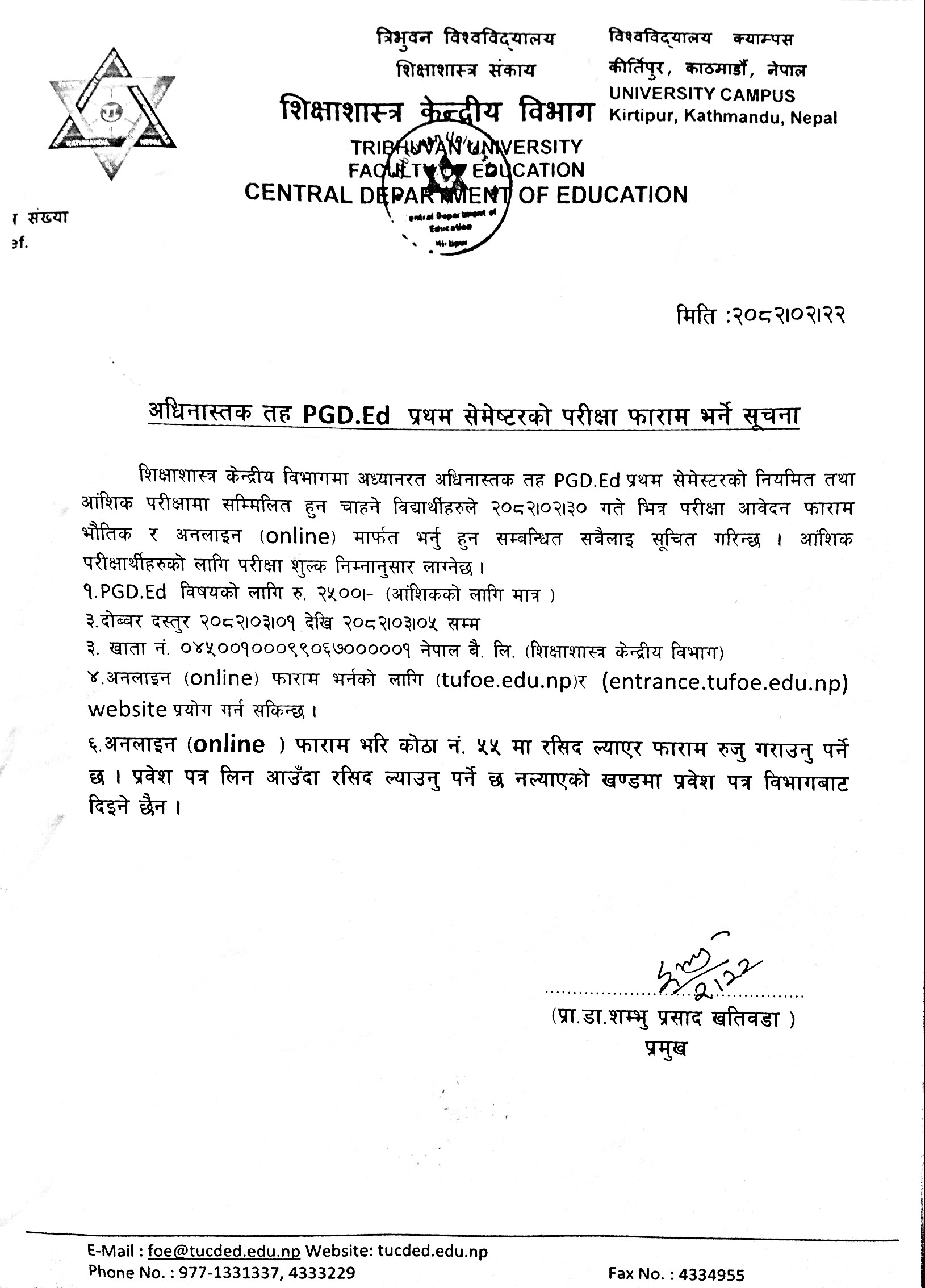 अधिस्नातक तह PGDE प्रथम सेमेष्टरको परीक्षा फाराम भर्ने सम्बन्धि सूचना ।