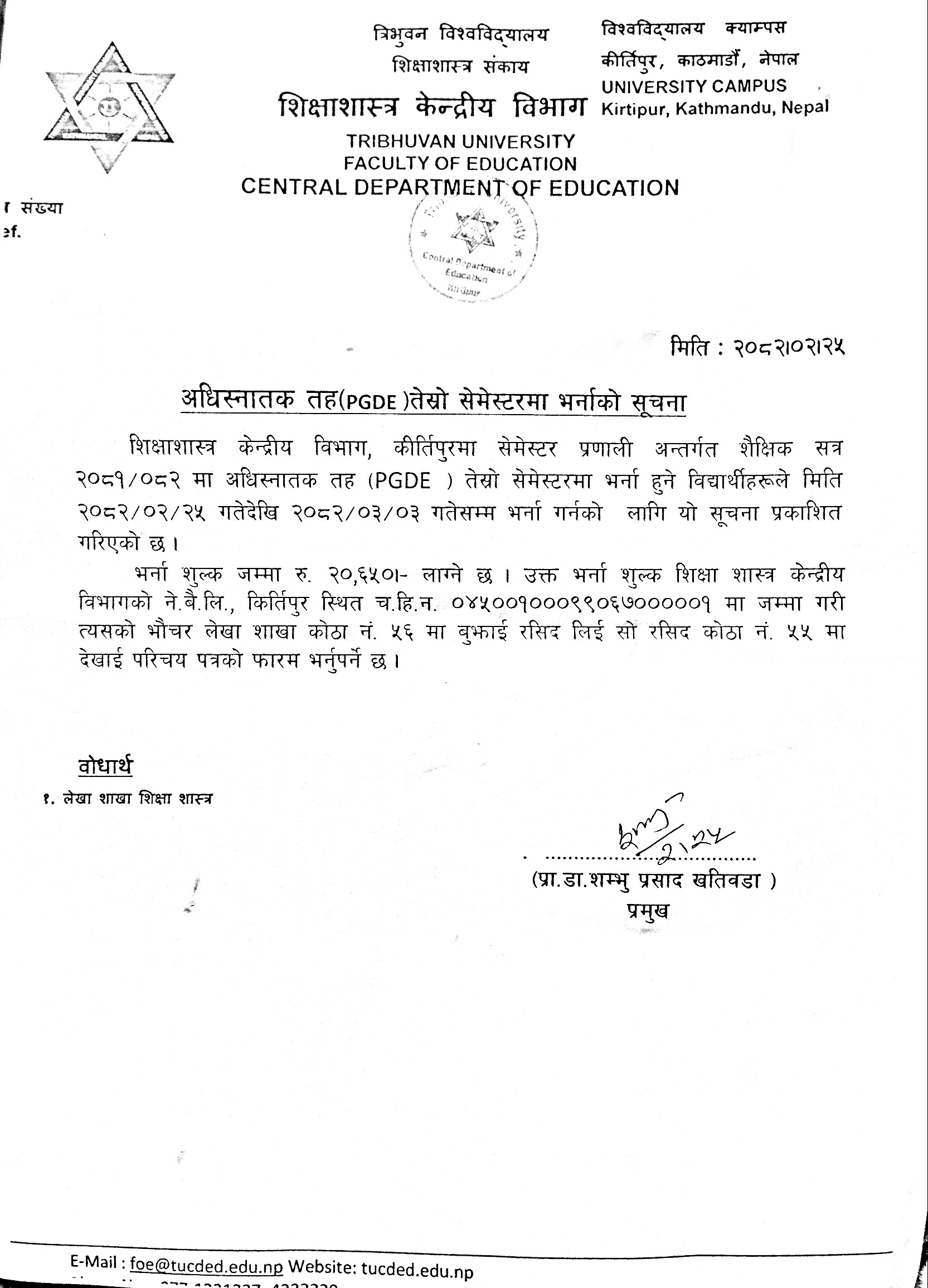 अधिस्नातक तह (PGDE) तेस्रो सेमेष्टरमा भर्ना सम्बन्धि सूचना ।