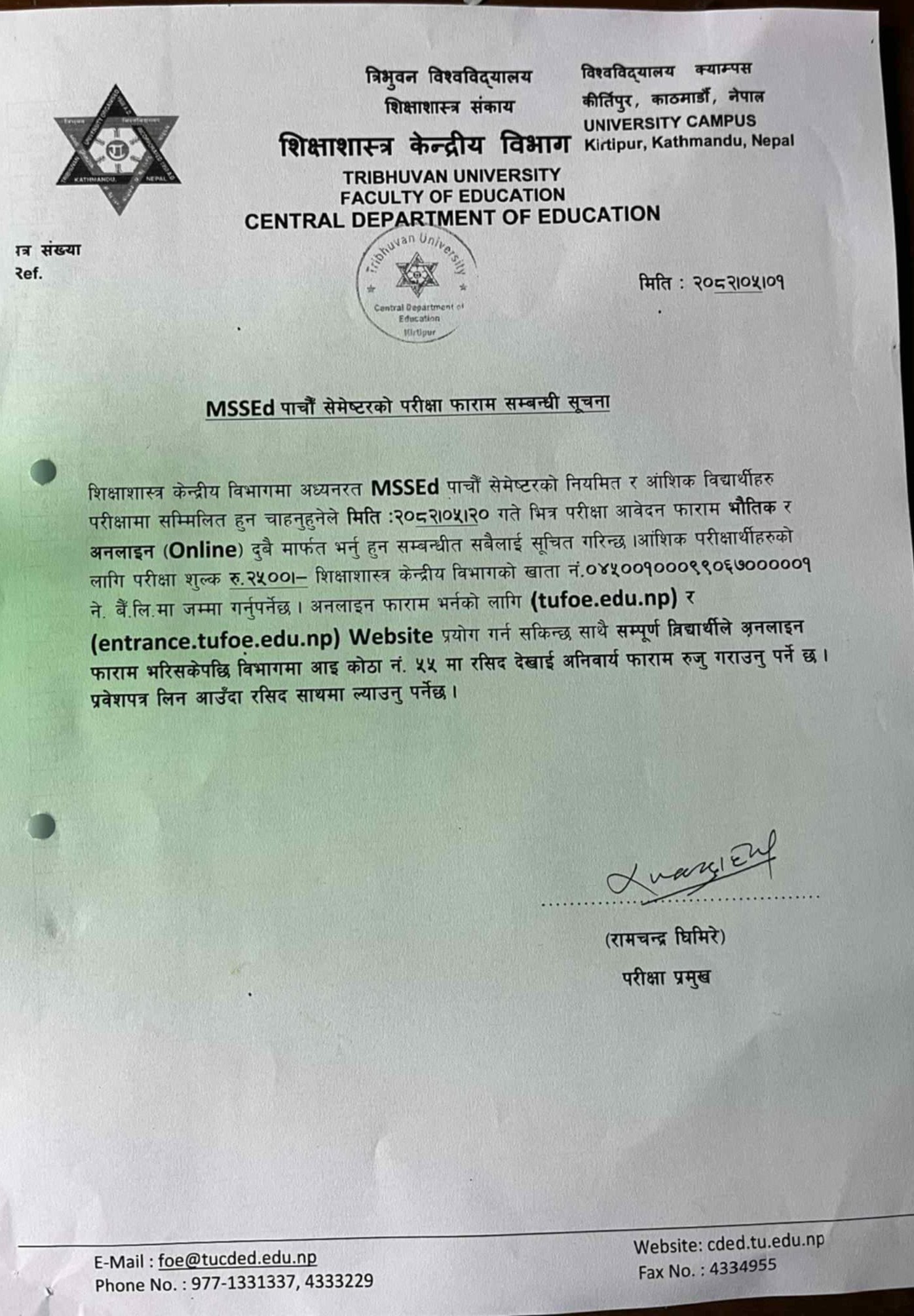 M.Ed and MSSEd प्रथम सेमेष्टरकाे परीक्षा फाराम भर्ने सम्बन्धी सूचना ।