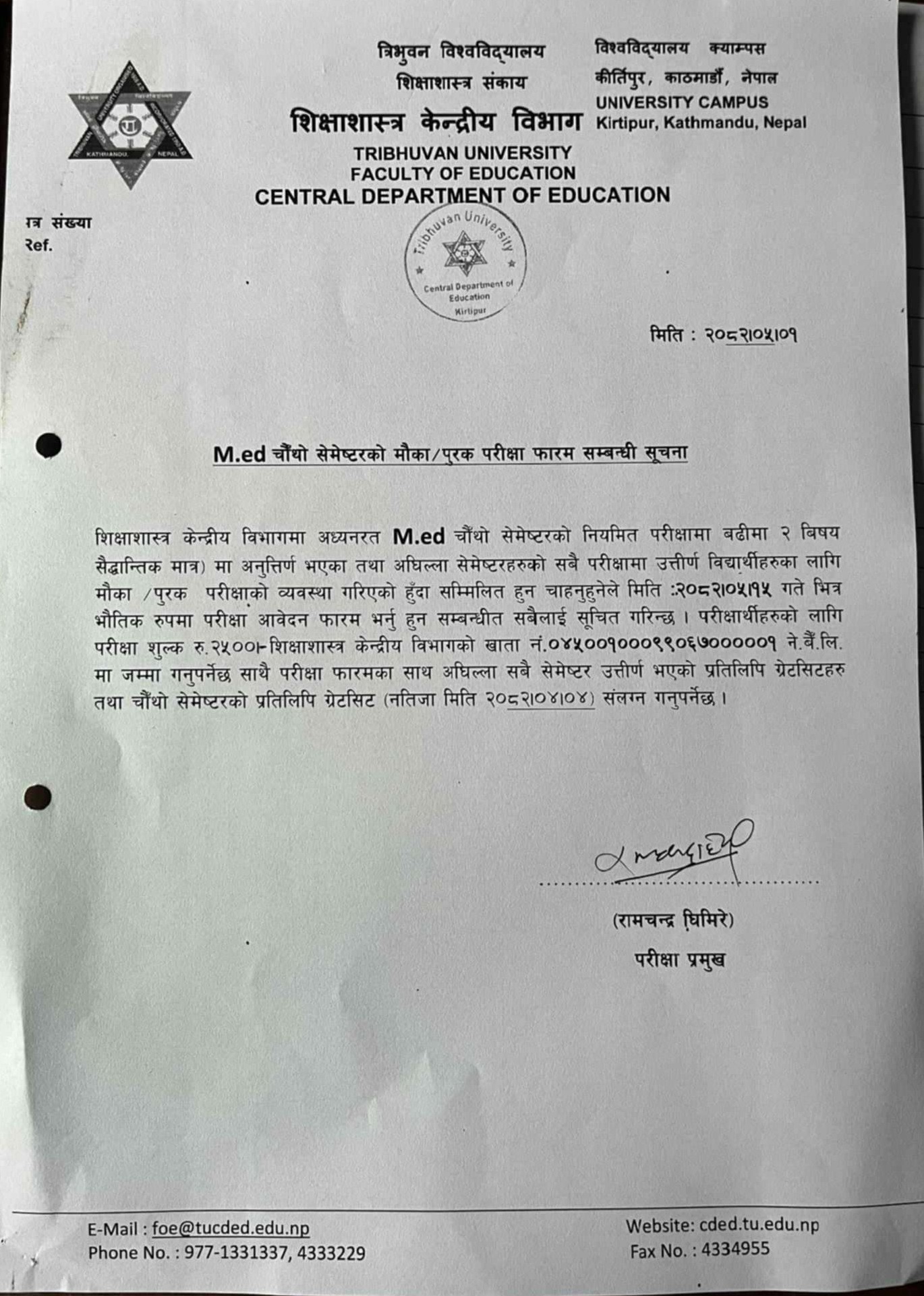 M.Ed. चौथो सेमेष्टरको मौका/पुरक परीक्षा फाराम सम्बन्धी सूचना ।