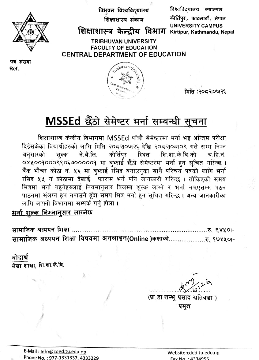 M.Ed and MSSEd प्रथम सेमेष्टरकाे परीक्षा फाराम भर्ने सम्बन्धी सूचना ।