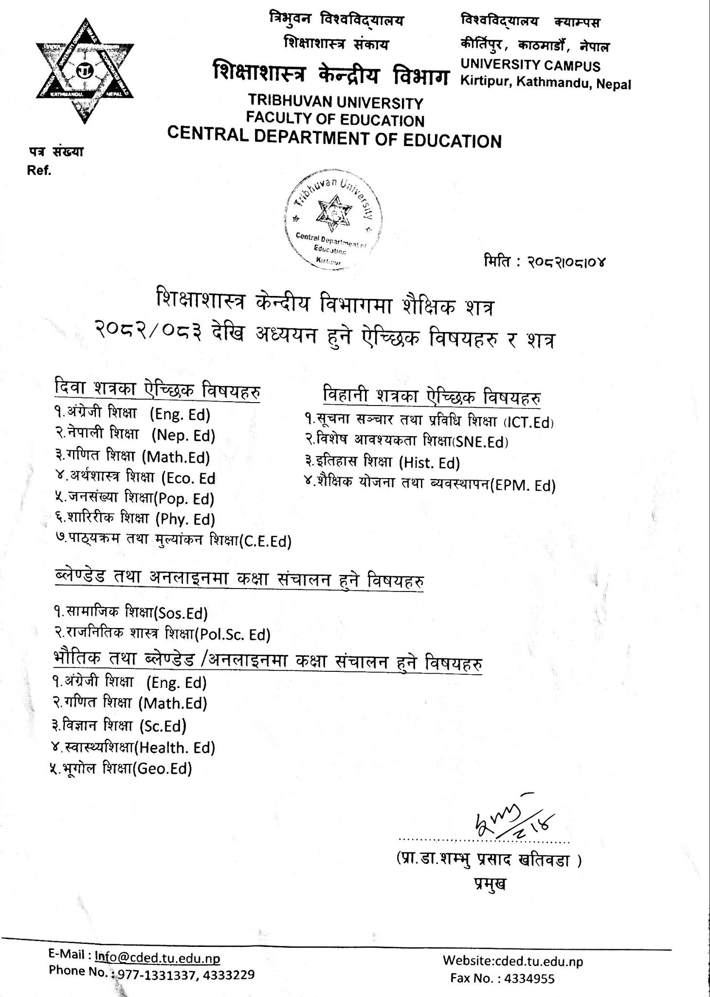 शिक्षाशास्त्र केन्द्रीय विभागमा शैक्षिक शत्र २०८२।०८३ देखि अध्ययन हुने ऐच्छिक विषयहरु र शत्र